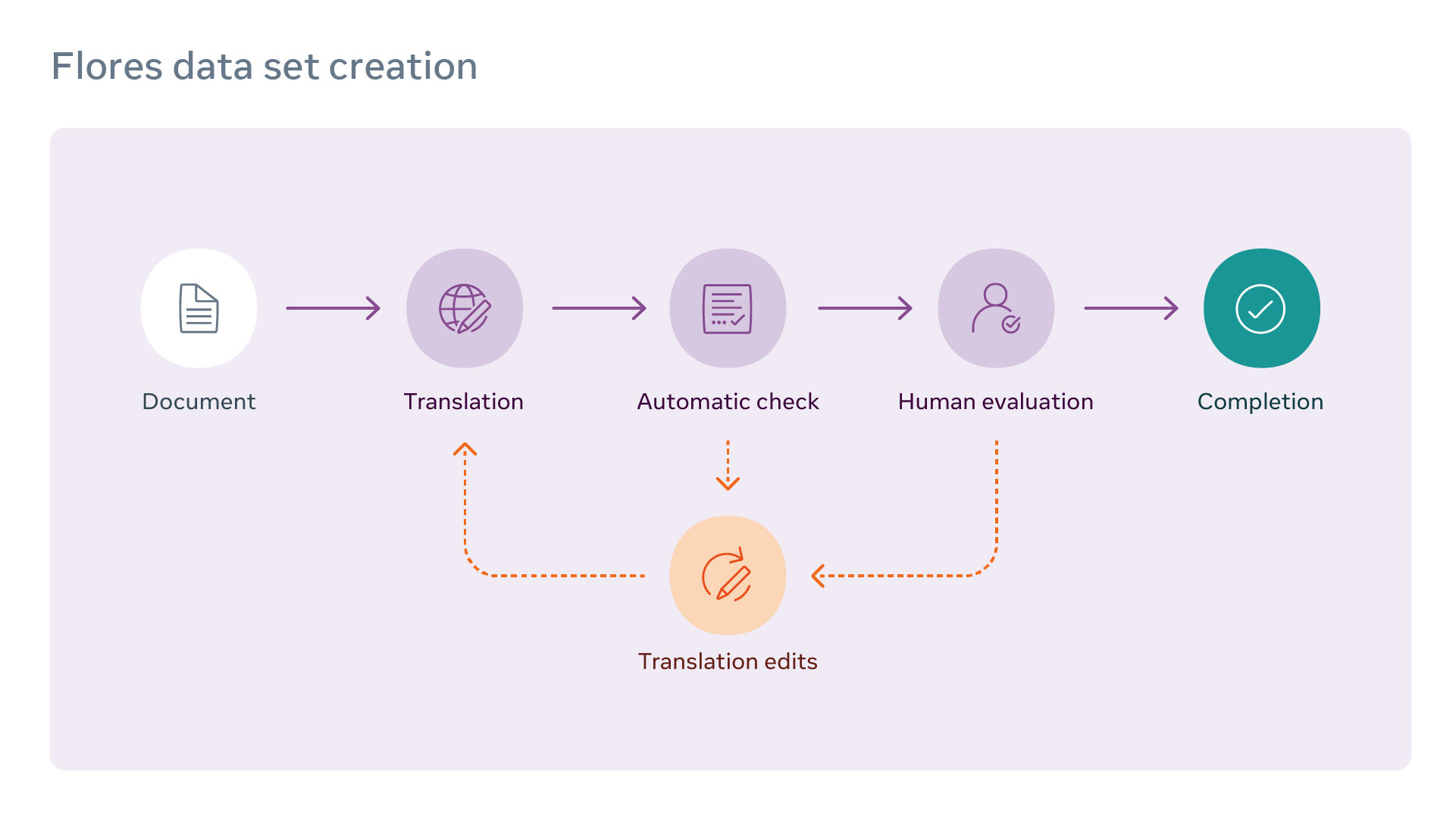 To create FLORES, each document was first translated by a professional translator, and then verified by a human editor. Next, it proceeded to the quality-control phase, including checks for spelling, grammar, punctuation, and formatting, and comparison with translations from commercial engines. After that, a different set of translators performed human evaluation, identifying errors across numerous categories including unnatural translation, register, and grammar. Based on the number and severity of the identified errors, the translations were either sent back for retranslation or — if they met quality standards — the translations were considered complete.